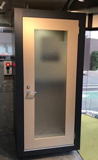 防音壁(グラスウール入り)・採光ガラス・LED証明・換気ファン・消防予通知第622号対応済・電源(100vx2)USBポート・キャスター付き(稼働可能)